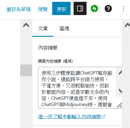 Meta Description 是一個重要的步驟,並非只有自架站,安裝 SEO 外掛才能使用的功能。現今許多部落格、網站及寫作平台都有提供類似「內容(文章)摘要」 的區塊,讓使用者填寫。而這個區塊就具有 Meta Description 的功能,它讓你有足夠的空間去敘述你文章(網頁)的主題,並串起一些你想餵給搜尋引擎的「廣泛比對關鍵字」,讓搜尋引擎建立相關的搜尋「索引」。